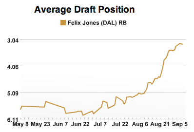 Felix Jones (25 yards rushing, 1 catch for 5 yards, 1 fumble). This was supposed to be Felix’s breakout year. Without competition for carries, Jones had a fantastic preseason, leading him to be “sleepered” his way up ADP charts. Waaay up. To the point where a lot of people severely overdrafted this perennial fantasy disappointment. Now with a separated shoulder and an unhealthy 2.7 yards per carry, those owners are paying the price. Suddenly, fans in Dallas are asking about rookie Demarco Murray… Analysis: You should never sell low, but….